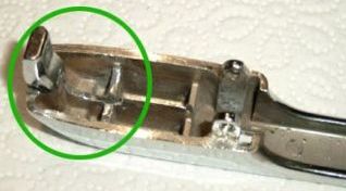 Also nimmt man sich wieder den Dremel zur Hand und passt das Gestell an dem der Hebel hängt, solange an, bis er in den Türgriff passt. Dafür kann man durchaus eine Flex mit Schrubbscheibe nehmen. Es lässt sich nicht verhindern, dass man auch ein wenig Material [~5mm] aus dem Golf1 Türgriff entfernt [Bild4, grüner Kreis].