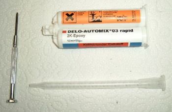 Also hab ich mich entschieden einfachen 2-Komponenten-Epoxy-Kleber zu nehmen [Bild 5 und 6]. Er ist am Anfang relativ flüssig und härtet nach dem Durchmischen von Harz und Härter in 15 Minuten sehr gut aus.