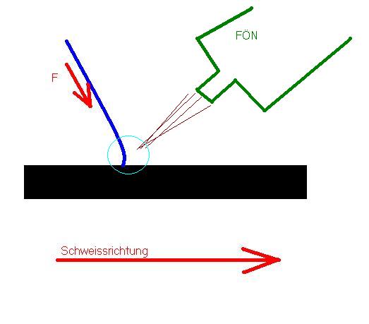 Nun von der Seite, der Schweißstab sollte leicht nach vorne gebogen werden, und du musst den Schweißstab schön andrücken.