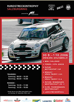 Mini Challenge am Salzburgring 26. September 2006, 20:27 30-09-06 / 01-10-06 2 Tages Ticket mit Fahrerlager 15 € weitere Infos : MSC-WOLFSBERG.at :-w Bilder Mini Challence.jpg 42,27 kB, 250×345, 174 mal angesehen