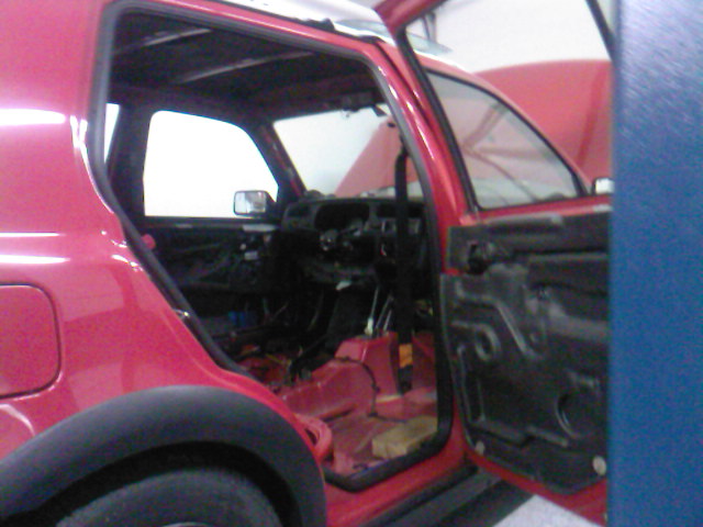 hab heute die letzten reste der innenausstattung ausgebaut. momentan nur mehr das amaturenbrett verbaut. am we sollt es losgehn mit den sitzen und da die konsolen marke eigenbau werdn, will ich ja nichts versauen mit schweißspritzern etc. somit flog die letztn tage alles raus.