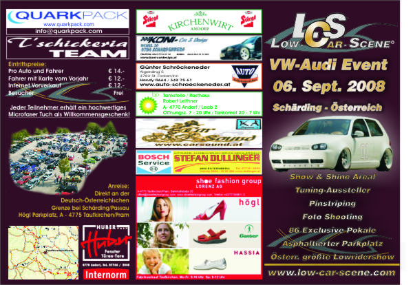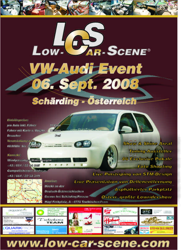 Am 6.September 2008 ist es wieder soweit. Nachdem es bereits beim LCS Event 2007 bis auf den kurzen heftigen Regenschauer super geklappt hat, machen wir natürlich auch heuer wieder unser Low-Car-Scene Event 2008 am selben Veranstaltungsgelände in Taufkirchen an der Pram / Höglparkplatz.