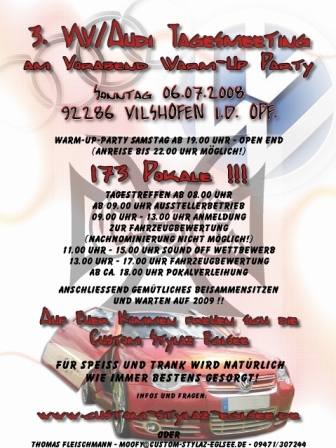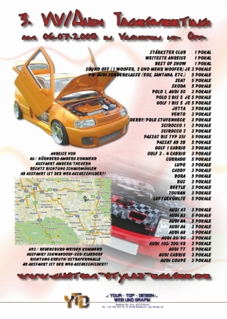 3. VW/Audi Tagesmeeting in Vilshofen am 6.7.08 4. Juli 2008, 20:09 War da schon MAL wer von euch?? Fährt jemand hin von euch? Bilder Flyer%20Seite%202%20_%20gross.jpg 141,23 kB, 319×448, 124 mal angesehen Flyer%20Seite%201%20_%20gross.jpg 142,05 kB, 336×448, 122 mal angesehen