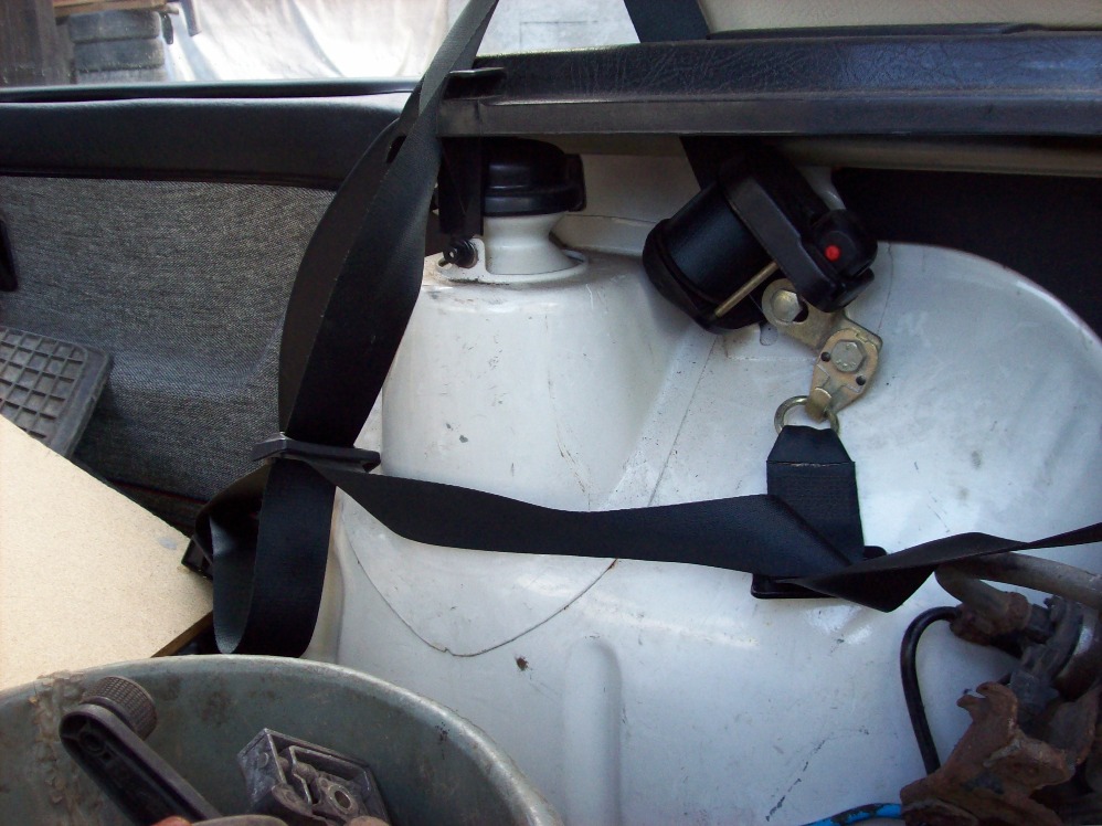 Schaut nach Zusatzgurt zur Befestigung eines eventuell MAL eingebauten Kindersitz aus,Der am Dom montierte Aufroller dürfte original sein. 17er Ratschennuss+kurze Verlängerung+Ratsche,aufschrauben,Zusatzgurt raus und original Aufroller wieder montieren.