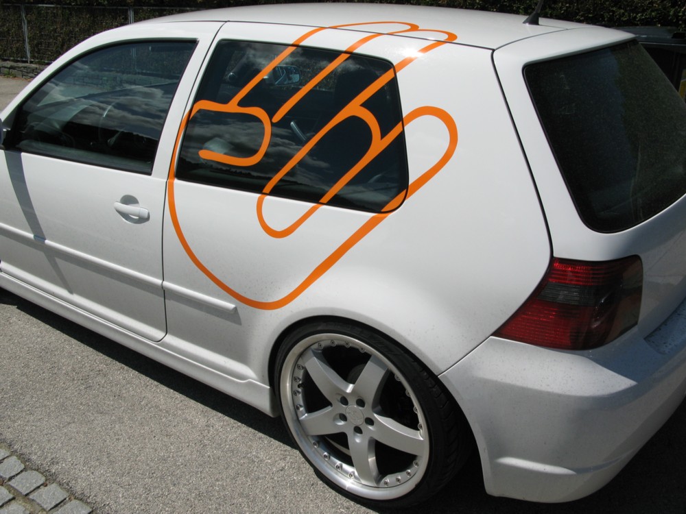 Ist kein Problem, der Sticker dar nur keine Markenrechte verletzen, also ein Emblem der VAG Gruppe zeigen.