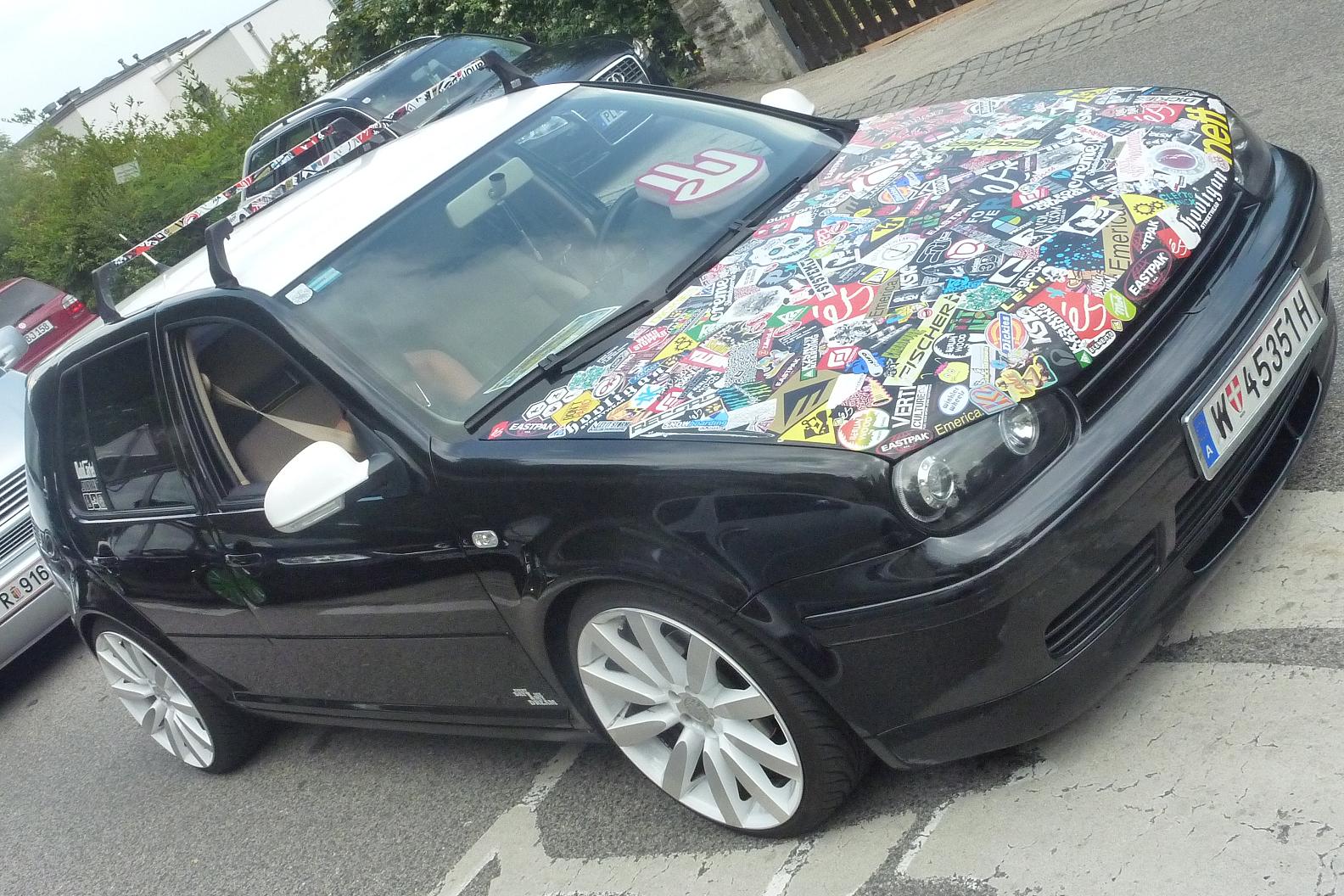 - Carbon (!) Motorhaube mit einzelnen Stickern beklebt und mit Klarlack überzogen (der Hingucker auf jedem Treffen), die Haube wurde davor mit einer schwarzen Folie beklebt und die Sticker können daher problemlos abgezogen werden