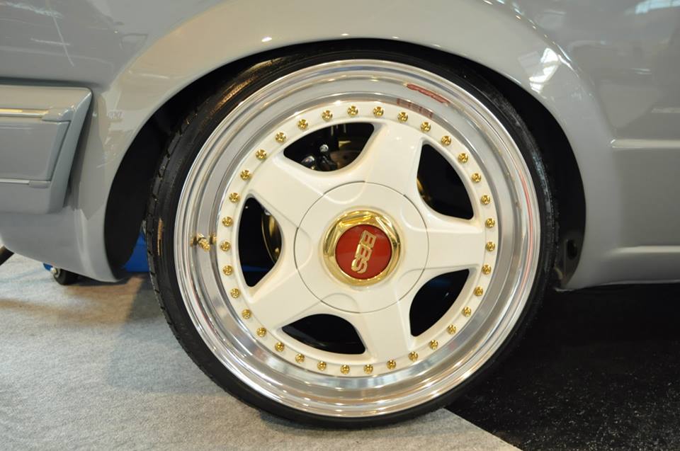 Alu Sechskant vergoldet, Stern weiß mit Keramikklarlack, Distanzring für verkehrten Zusammenbau, Org. rotes BBS Emblem, Innen uns Außenbetten verdichtet, Schrauben 7x40 Gold, Ventile Gold, BBS Sticker